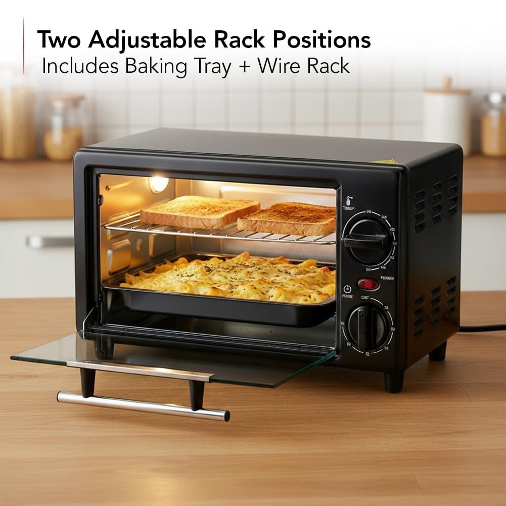 EFFICIENT HEATING & EASY CLEANUP – Powered by 750 watts, this toaster oven features a built-in thermostat that ensures consistent heat for even cooking. The removable crumb tray catches drippings and debris for quick disposal, while the wire rack and baking tray are easy to clean. Simply wash them after use and wipe down the interior with a clean cloth.